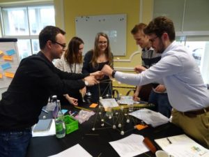 Delegates built spaghetti and marshmallows structures to develop an understanding of team dynamics.� L-R:� Callum Grove, University of Surrey; Caitlin Walsh, RHUL; Dr Brianna Smart, University of Hertfordshire; Yannick Kluth, University of Sussex and Leon Schoonderwoerd, University of Kent.