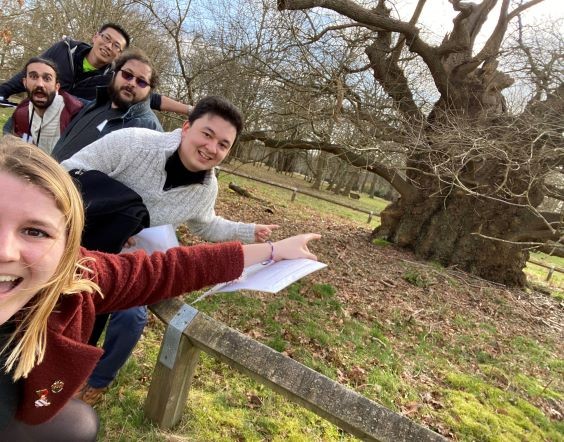 Selfie at the "Twisted Tree" from the top:� Shing-Cheung Lee, Dr Giovanni Mirouh, Gabriele Parisi, University of Surrey;�Benjamin Man, University of Sussex and Florence Roberts, RHUL.