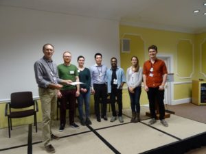 Congratulations to the winners of the BlueOptima challenge. L-R: Mark Horner , Performance Pathways with Dr Andrew Williamson, University of Portsmouth; Duy Bui, BlueOptima; Giri Man, RHUL; Stephanie Biddlecombe and Matt Brunet, University of Surrey.